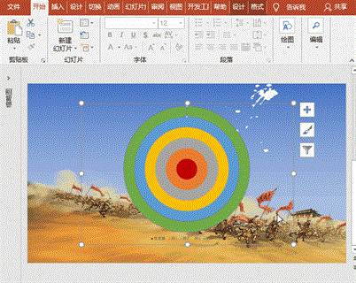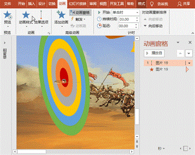 (3)枪孔动画:选择枪靶,点击“开始”菜单-“格式刷”,点刷枪孔图片,使枪孔图片得到与枪靶同样的三维效果;调整枪孔大小和位置,执行“动画”菜单-“添加动画”-“进入”之“淡入”,设置开始为“与上一动画同时”、持续时间0.5秒、延迟0;