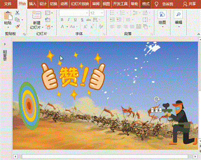 最佳答案实现思路:开枪射击,子弹飞出——击中靶心,子弹消失,留下弹孔——点赞。制作步骤:1、背景布置:(1)背景设置:打开PowerPoint2016软件,新建幻灯片,右键“设置背景格式”-填充中选择“渐变填充”,渐变光圈中选择蓝白渐变;(2)插入底图:执行“插入”菜单-“图像”-“图片”命令,插入准备好背......