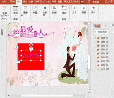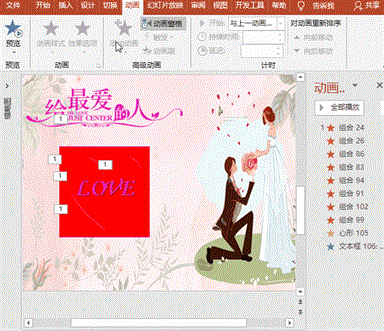 选中爱心,执行“动画”菜单-“添加动画”-“强调”之“脉冲”命令,在“动画窗格”对话框中,设置计时标签开始为“与上一动画同时”、延迟为“0秒”、期间为“1秒”、重复为“直到下一次单击”;