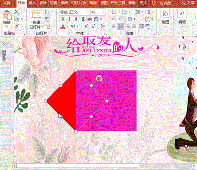 选定三角形,按住Ctrl键复制,执行“格式”菜单-“排列”-“水平翻转”,与原三角形斜边对齐后,选定两个三角形,右键“组合”,并将左侧三角形填充为无;同样按Ctrl键复制组合的三角形,并将右侧三角形填充为粉色;