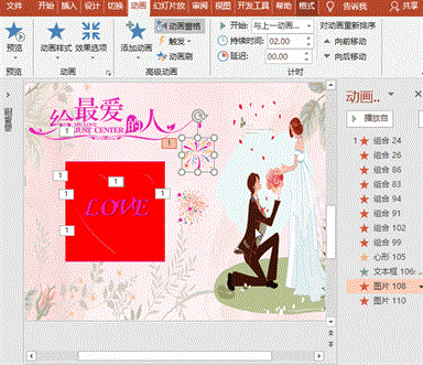 复制设置好的烟花,也可插入不同的烟花,任意改变持续时间和延迟时间,达到随意燃放的效果;最后应选择“给最爱的人”图片,右键“置于顶层”。