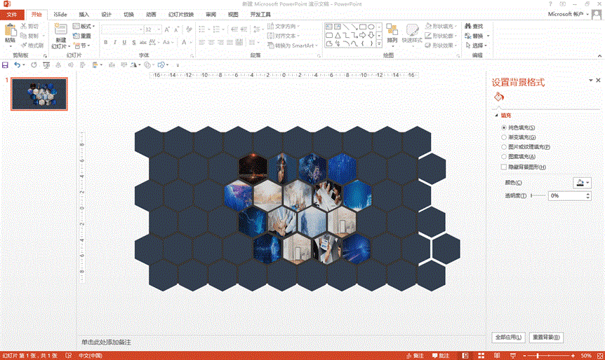 为了强化排版效果,我们将边缘的几张图片的透明度提高一点,大约50%,中间几张需要重点突出的图片透明度调低一点,大约20%,这样一个蜂窝状的图片墙就做好了,看一下整体效果。