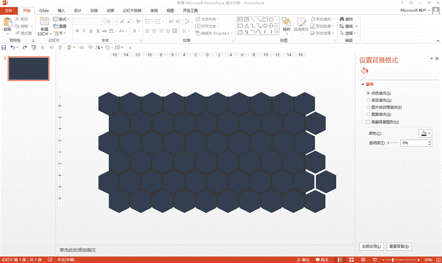 先将PPT页面的背景色填充为深灰色,然后插入Smartart中的交替六边形,在边框上右键将其转换为形状,并Ctrl+shift+G取消组合,去掉其中的文本框,选中所有的六边形,去掉边框,将颜色填充为深蓝色,然后全选,Ctrl+G进行组合,按住shift键进行同比例缩小。将其放在适当的位置,按住Ctrl+shift键向右平行复制一份,然后按F4重复上一步操作,然后全选,并向下拖动复制一份,将所有的形状选中,Ctrl+shift+G取消组合,复制其中一个,补齐到空白区域。
