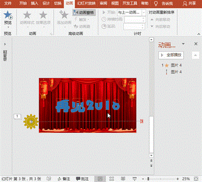 选中车轮图片,执行“动画”菜单-“添加动画”-“强调”之“陀螺旋”命令,单击“动画”菜单-“动画窗格”按钮打开“动画窗格”项,单击右侧的小黑箭头,在打开的对话框中,设置效果标签中数量为“360°顺时针”、平滑开始和平滑结束均为0秒,设置计时标签开始为“单击时”、延迟为“0秒”、期间为“2秒”、重复为“直到幻灯片末尾”;执行“动画”菜单-“添加动画”-动作路径之“直线”命令,按住Shift键水平拖动终点于幻灯片外右侧,同样在“动画窗格”对话框中,设置效果标签中平滑开始、平滑结束均为0秒,设置计时标签中开始为“与上一动画同时”、延迟为“0秒”、期间为“8秒”;