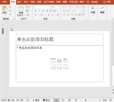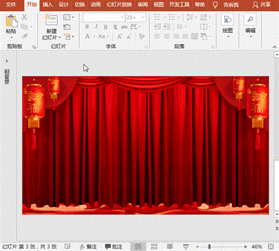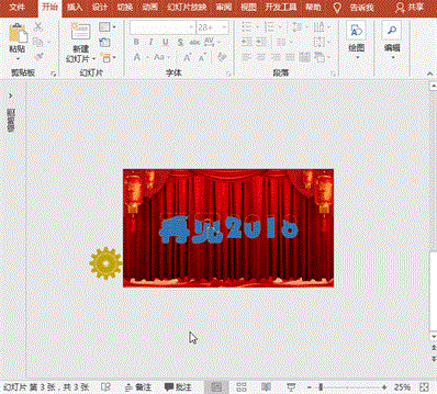 执行“插入”菜单-“图像”-“图片”命令,插入准备好的“再见2018”文字图片调整其大小,置于幻灯片正中;同样插入年轮图片,置于幻灯片外左侧、“再见2018”文字图片的下方;