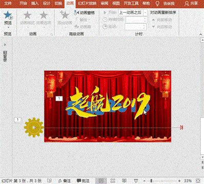 选中幻灯片中的车轮图片,按Ctrl键复制,修改其“陀螺旋”的开始为“上一动画之后”;并将两车轮图片重合放置;