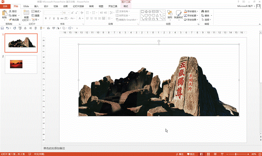 首先来看看这张泰山的图片,我们希望将其制作成旗帜的形状,我们只需要插入旗帜形状,放在图片的适当位置,然后先选中图片再选中形状,在形状合并里选择相交,这样旗帜形状的泰山就出来了。