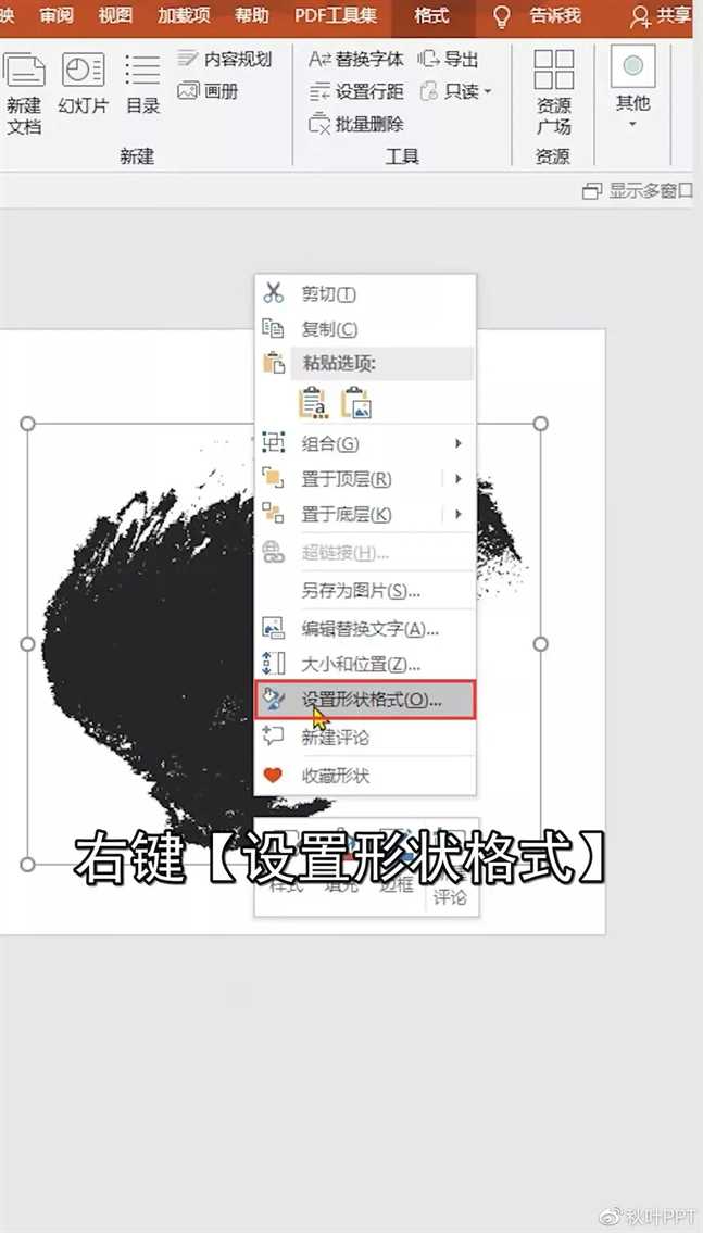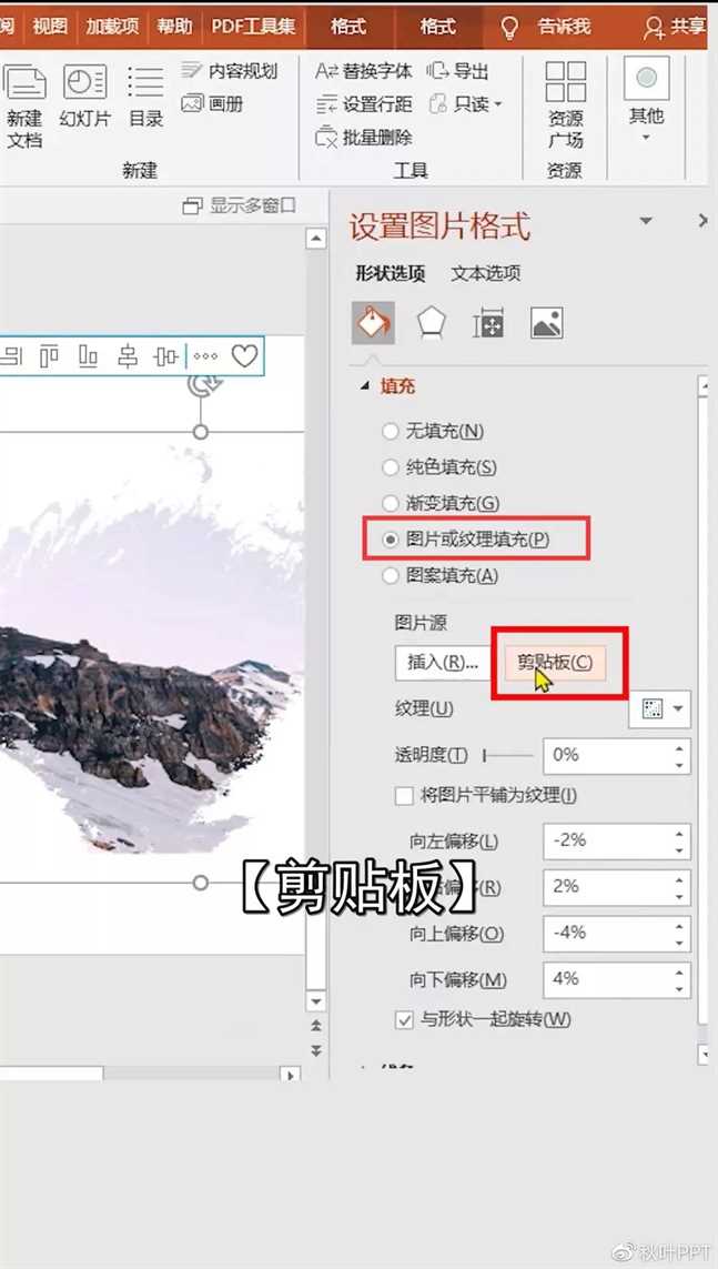 ❸ 单击【右键】-【设置形状格式】,点击【图片或文理填充】-【剪切板】。