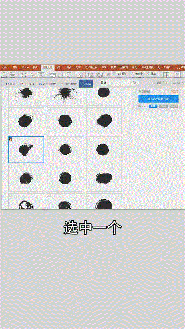 ❷ 选中一个你喜欢的【墨迹】效果,点击【插入选中形状】将效果插入到 PPT 里,再【 Ctrl+X 】剪切图片。