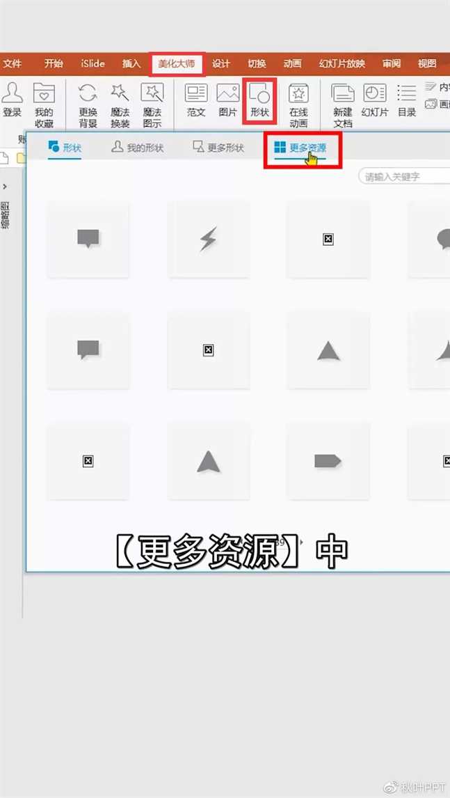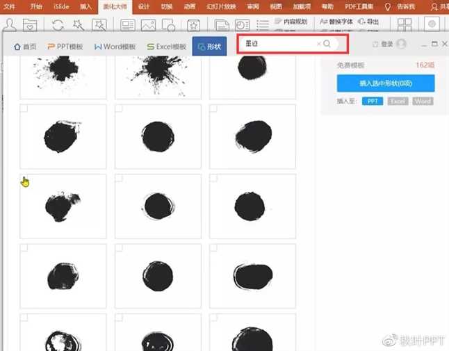 ❶ 首先你需要安装一个【美化大师】的插件,下载后,在菜单栏找到【美化大师】,点击【形状】-【更多资源】,在搜索框中输入【墨迹】。