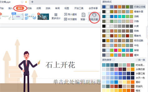 选择【设计】中的【配色方案】,在弹出的菜单中选择合适的颜色搭配。