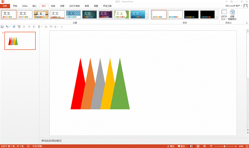 首先,我们需要了解主题配色原理。我们画一个三角形,去掉轮廓,按住Ctrl+shift向右拖动,即可平行复制,复制出来四份,然后分别填充不一样的颜色。然后打开设计选项卡下的变体,找到颜色选项,系统为我们提供了很多种配色方案,将鼠标放在上面就会出现预览效果,我们也可以自定义一份自己喜欢的配色方案。打开自定义窗格发现这里有很多选择,其中前两个“文字/背景”是默认文本颜色,后面两个“文字/背景”是默认背景颜色,着色1是默认形状颜色,着色2-6是默认辅助颜色,辅助颜色根据形状的先后顺序一次填充,如果图形叫多就会循环进行。最后两个是默认链接颜色。我们将着色1修改为红色,并定义一下名称,确认后再次打开颜色就显示了刚才我们设定好的样式。