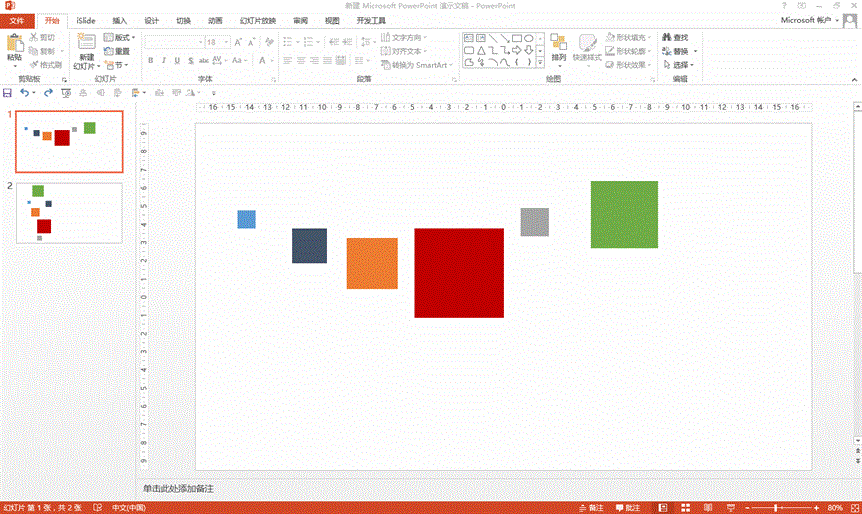 先来看一下横向分布,这里有好几个大小不一的正方形,我们现在需要将它们横向等距排布在一条直线上。既然是排在一条直线上那就先选中所有图形,在对齐选项中选择“上下居中”,然后在点击横向分布,这样就完成了。横向分布的意思是以第一个和最后一个图形元素为距离的起止点,不管中间有多少个,都按照相同的间距进行排列,如果希望间距小,两端的距离就拉小一点,如果希望间距大,就把两端的距离加大一点。纵向分不也是一样的道理,这里就不再赘述了,看动图演示即可。