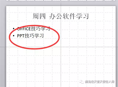 第二步,用“降低/提高列表级别”来分级显示;本案例把光标移到PPT技巧学习,然后选择工具栏中提高列表级别。效果就如本文开头的例子所示。