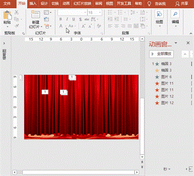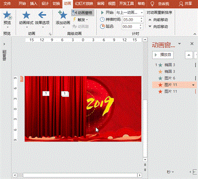 (3)右侧拉幕设置:选择左侧拉幕,按Ctrl+Shift键向右拖动复制,执行“格式”-“水平翻转”,调整其位置置于右侧;动画选项中净退出动画均修改为“到右侧”;