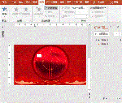 (2)圆环动画设置:“动画”菜单-“添加动画”-“进入”之“出现”,设置开始为“单击时”、持续时间自动、延迟0;“动画”菜单-“添加动画”-“强调”之“放大/缩小”,点击动画菜单之“动画窗格”按钮,点击右侧箭头,效果设置尺寸为600%,计时标签中设置开始为“与上一动画同时”、延迟0、期间0.8秒,重复为“到幻灯片末尾”;