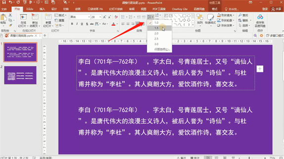 下面我们来看一下如何将上面的段落文本由一倍行距调整为1.5倍行距。选中整个文本框,在开始选项卡段落功能组中找到行距按钮。单击在下拉列表中选择1.5,这样段落文本行与行之间的距离就变大了。