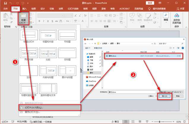 在开始选项卡幻灯片功能区中,点击“新建幻灯片”下方的小箭头,选中下拉菜单中的“幻灯片(从大纲)”,根据Word文档的存储路径找到上一步保存的Word文档,点击选中并插入。