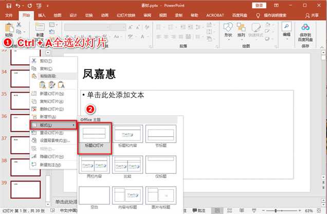 左键单击选中左侧幻灯片缩略视图中的任意一张幻灯片,同时按下键盘上的Ctrl+A键全选幻灯片,右键单击后,选中右键菜单中的“版式”,将版式设置为“标题幻灯片”,这样每一个姓名就移至每一张幻灯片的中央。
