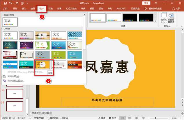在设计选项卡中,点击主题中的下拉小箭头,选择“徽章”主题。