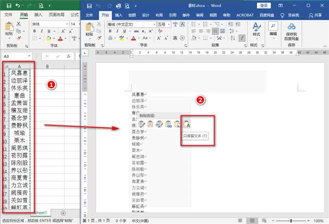 首先需要将Excel中的姓名粘贴到Word中,请不要直接粘贴,在Word文档空白位置右键单击后,选择“只保留文本”选项粘贴姓名。