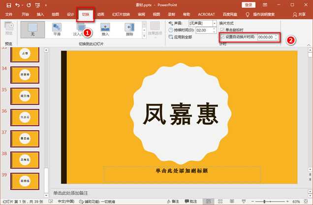 保持幻灯片的全选状态,在切换选项卡,计时功能区中,点击自动换片时间前的小方格启用自动换片,并将自动换片时间设置为00:00.00秒。