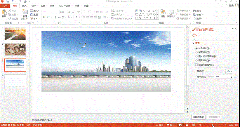 第三种是通过裁剪为画布大小的尺寸然后进行填充,这就省去了拉伸模式下调整偏移量的操作,也比平铺模式更方便,前提是图片要足够清晰哦。将图片粘贴进来,然后在裁剪里面选择“纵横比”,按照这个PPT页面的16:9的比例进行裁剪,一定记得要按住shift键。裁剪完毕Ctrl+X剪切图片,然后从剪贴板选择进行填充,这样就填充完毕了,是不是很简单呢?