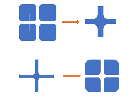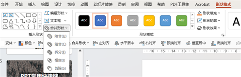 大家注意观察会发现,上面五个功能中,总是有两个不同的效果出现,那是因为,我们得到的结果,是与你在选择过程中,第一个选择的形状格式是一致的。也就是说你有多少个形状参与合并,那么就会有多少种效果,你只需要第一个点击你最后想要的效果就好。