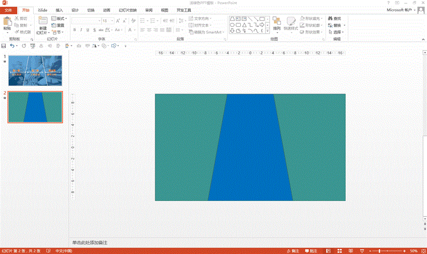 在空白页插入矩形背景,然后居中插入一个梯形,高度要比矩形高一些,然后将两个形状选中(这里不分先后),在合并形状里面选择拆分,所有有交叉的地方都被拆分开了,将多余的地方删掉即可。