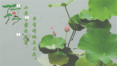(1)“插入”菜单-“文本”-“文本框”-“竖排文本框”,输入文字“小荷才露尖尖角,”,设置字体为华文行楷、字号48、阴影、颜色为绿色。