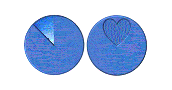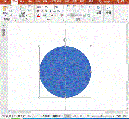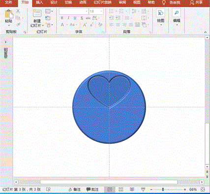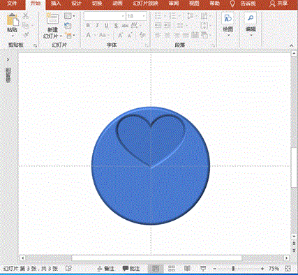 3、“插入”菜单-“形状”-“心形”,插入大小约比圆形一半稍小的心形形状,并置于上半圆内,使心形的下点与圆心重合;全选心形与圆形,执行“格式”菜单-“合并形状”-“拆分”按钮,将圆形镂空出心形的图案。