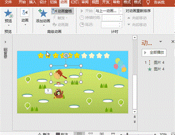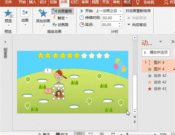 选择地鼠,执行“动画”菜单-“添加动画”-“其他动作路径”之“向下”,按Shift键向下调整起点、终点位置,使地鼠的身体遁入洞穴,“动画窗格”框中,效果标签中设置平滑开始和平滑结束均为0,计时标签中设置开始为“上一动画同时”、延迟为0秒、期间为0.5秒;执行“动画”菜单-“添加动画”-“进入”之“擦除”,设置开始为“上一动画同时”、延迟为0秒、期间为0.5秒、“效果选项”为“自底部”;