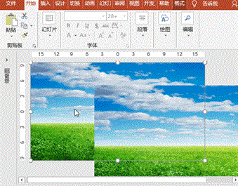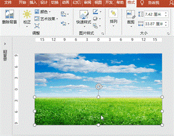 双击其中的一张图片,执行“格式”菜单-“大小”-“裁剪”工具,将图片下方绿草部分裁剪去除,只保留上方蓝天白云部分;同理将另一张图片上方蓝天白云裁剪去除,只保留下方的绿草部分;