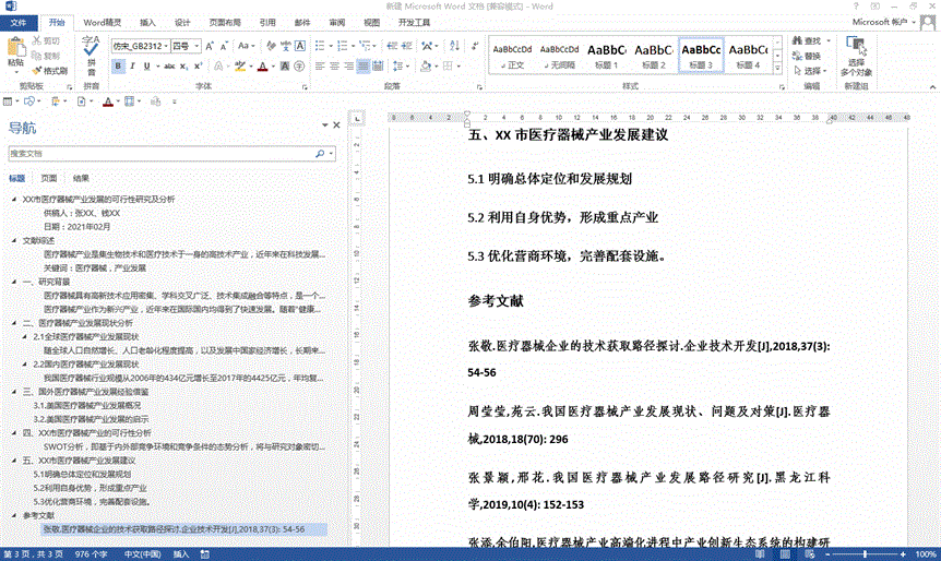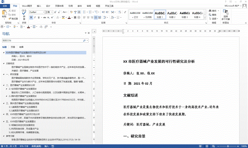 首先需要了解的是PPT智能识别Word大纲视图下的内容,如果一篇文档都是正文内容,是无法实现转化的。因此第一部就是在视图选项下打开导航窗格,然后打开开始选项卡,选中相关标题将其设置为对应的标题样式,系统默认一级标题及其所有内容会显示在一张PPT上,正文同样也要设置级别,可以设置成三级标题的样式。全部设置完成,确保整个文档的内容都在左侧完全显示出来。