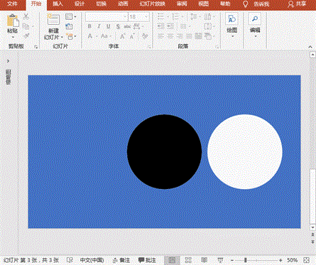 3、选择黑色正圆,执行“动画”菜单-“添加动画”-“动作路径”-“直线”命令,设置地球动画的起点为镂空的左侧、终点为镂空的右侧,持续时间为20秒;选择白色的正圆,执行“动画”菜单-“添加动画”-“强调”-“对象颜色”命令,设置效果选项为橙色、开始为“与上一动画同时”、持续时间为10秒、延迟时间为0,再次执行“对象颜色”命令,设置效果选项为白色、开始为“与上一动画同时”、持续时间为10秒、延迟时间为10秒,并将两圆重叠,且白色圆位于最底层;同理设置背景的天空颜色从白色至黑色再至白色。
