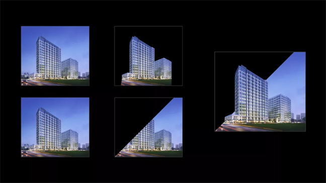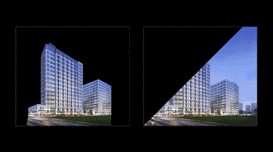 这个效果很简单,由两层图片构成而已。上层的图片把大楼抠出来,然后对底层图片进行一个简单裁剪: