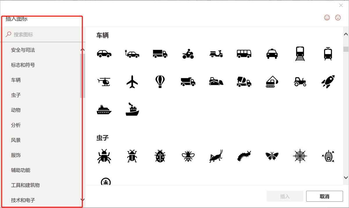 3、根据分类选择或者自己在搜索框搜索您想要的图标。制作PPT的时候可能没有时间一一查看各个图标,我每次都是直接在“搜索图标”这里直接打上我想要的内容,相关的图标就会出现。