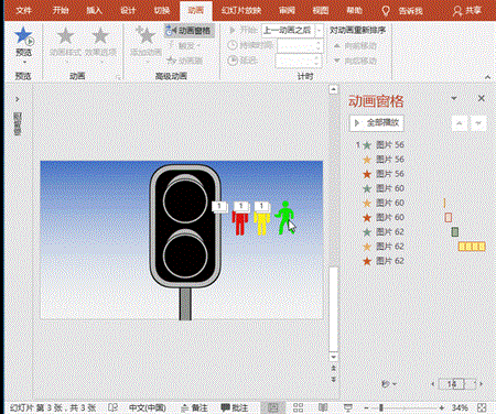 (2)黄色和绿色人像:保持红色人像为选中状态,双击“动画”-“动画刷”按钮,分别刷黄色和绿色人像,开始均设置为“上一动画之后”、黄色重复为6、绿色重复为18。