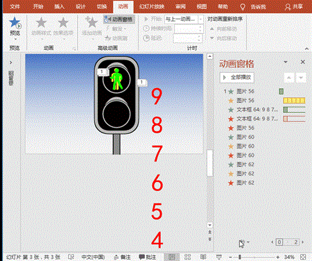 (3)黄色、绿色数字动画:复制红色字体文本框2份,一份更改文字颜色为黄色、3-0数字,一份更改文字颜色为绿色,分别将动画置于人像退出动画之前;