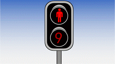 红灯亮禁行,闪烁的同时倒计时9秒(实际交通红绿灯多数在60秒以上,这里权宜模拟哈);倒计时至0时,黄灯亮警示,闪烁的同时倒计时3秒;倒计时至0时,绿灯亮通行,闪烁的同时倒计时9秒;红灯亮禁行……