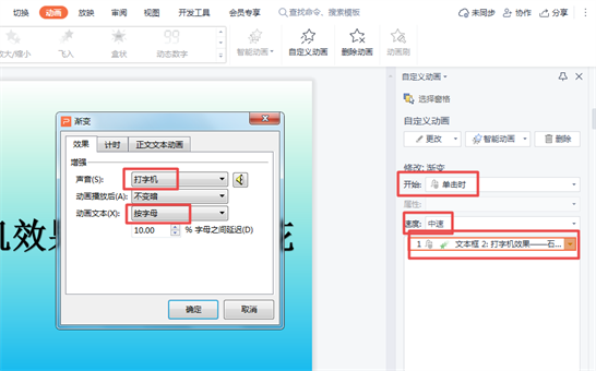 三、在此时的自定义动画设置窗口,选择修改效果【开始】设置为:单击时;【速度】设置为:中速;然后在单击【渐变效果】——【效果选项】,在此时的小窗口中设置声音:打字机,动画文本:按字母