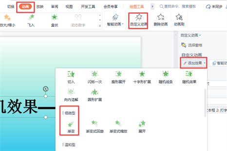 二、选中文本框,点击菜单栏中【动画】——【自定义动画】——【添加效果】——【细微型:渐变】