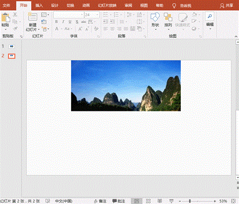 1、打开PPT软件,插入一张拍摄的风景图片。选择该图片,按住【Ctrl】键拖动复制一张放置在原图片的下方。