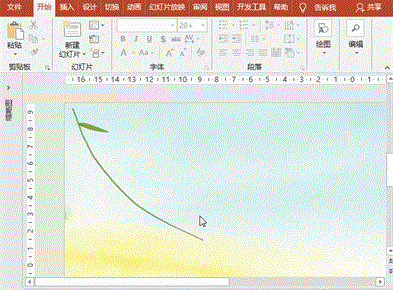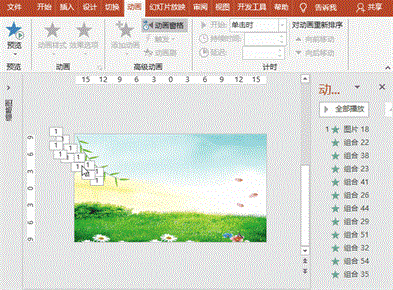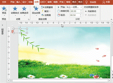 (3)整片柳叶动画:选择已设的单片柳叶,双击“动画”菜单-“动画刷”按钮,从左至右顺次点击各片柳叶,并在动画空格中将各片柳叶的延迟时间递增0.5秒;