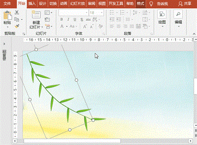 (2)柳叶对称设置:选择柳叶,插入”菜单-“形状”-“矩形”,编制出与柳叶外框等大小的矩形,与柳叶对称放置,将矩形设置为无填充、无轮廓,并右键将两者“组合”,“生长”于柳条上;