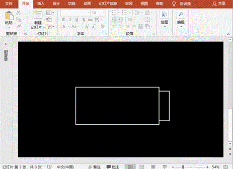 2、电池外框制作:“插入”菜单-“形状”-“矩形”,绘制水平向的矩形,设置为无填充、轮廓线为白色、轮廓线条粗细为3磅;按住键盘的Ctrl键,向右复制、缩小,置于右侧垂直居中对齐后,全选并组合之。