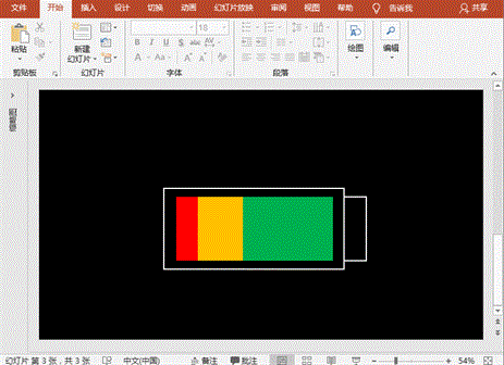 3、绘制充电色块:“插入”菜单-“形状”-“矩形”,绘制比电池轮廓小些的水平向矩形,设置填充为绿色、无轮廓线;同样按住键盘的Ctrl键,向左复制2个矩形,分别填充为红色和黄色,调整其为垂直居中对齐,并调整大小首尾相接后,全选并组合之。