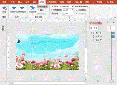 (1)蝴蝶飞入花丛:同时选择翅膀和身子,移至幻灯片外,“动画”菜单-“添加动画”-“动作路径”之“自定义路径”,绘制蝴蝶飞行路径,拖动终止至花朵之上,设置开始为1个是“单击时”1个是“与上一动画同时”、延迟为“0”、持续时间“20秒”,这样形成了翅膀和身子的2个路径;