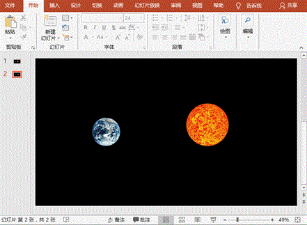 2、切换到【插入】菜单,选择【图像】组中的【图片】按钮。分别插入地球和太阳两张素材图片,并调整两张图片的大小和位置。