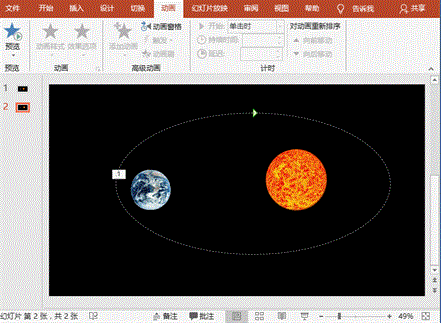最佳答案操作步骤1、打开PowerPoint软件,新建幻灯片,设置背景为黑色。2、切换到【插入】菜单,选择【图像】组中的【图片】按钮。分别插入地球和太阳两张素材图片,并调整两张图片的大小和位置。3、选中地球,切换到【动画】菜单,点击在【添加动画】组中的【其他动作路径】选项。在弹出的【添加动作路径】对话框中,......